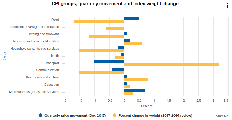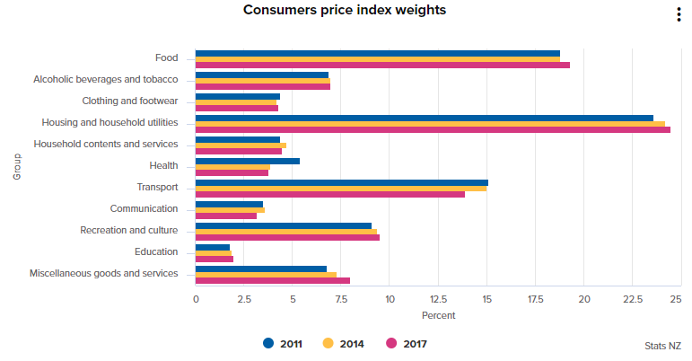 CPI作为一个数量加权的平均价格指数,权重的选择是至关重要的。本季度新西兰统计局对2017年CPI回顾进行了补充。每三年,统计局都会根据目前的家庭开支水平,对CPI内的项目及其相权重进行评估。随着消费模式的变化,评估范围内的商品和服务有所,以准确跟踪家庭所经历的价格变化。