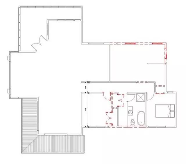 在设计加建房的时候,设计师会考量新房和旧房衔接部分的设计,将其最小化,以减少旧房的拆除面积 (如下图红色边线)。
