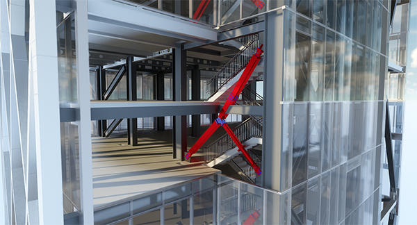 建筑设计师采用了明亮的颜色来强调它和大楼的结合,使得在玻璃楼梯井墙外面也清晰可见。