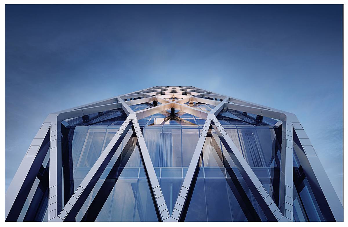 为了实现每个公寓都有清晰、通透的朝北景观, 该塔楼采用了外部结构巨型框架的建筑表达方式, 用菱形模式支撑来抓住眼球。