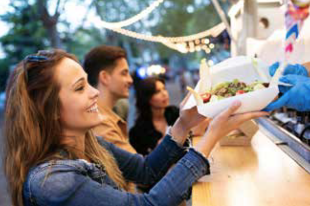 与朋友聊天,喝咖啡或在现场的美食餐车上用餐!