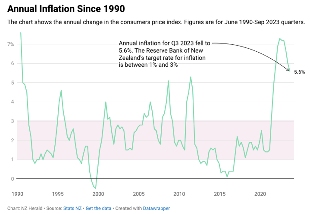 1990年至今新西兰年通货膨胀率曲线变化图 (来源:新西兰统计局)