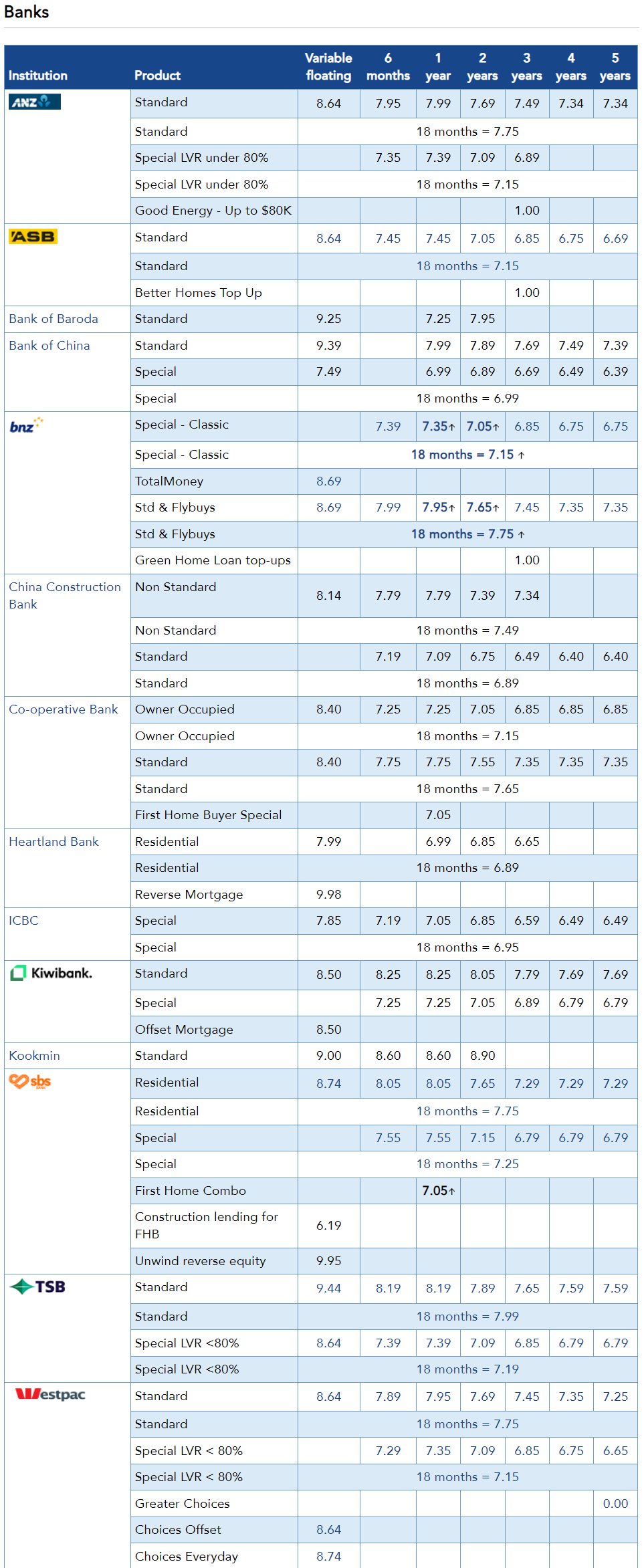 目前,新西兰各大银行利率表如下: