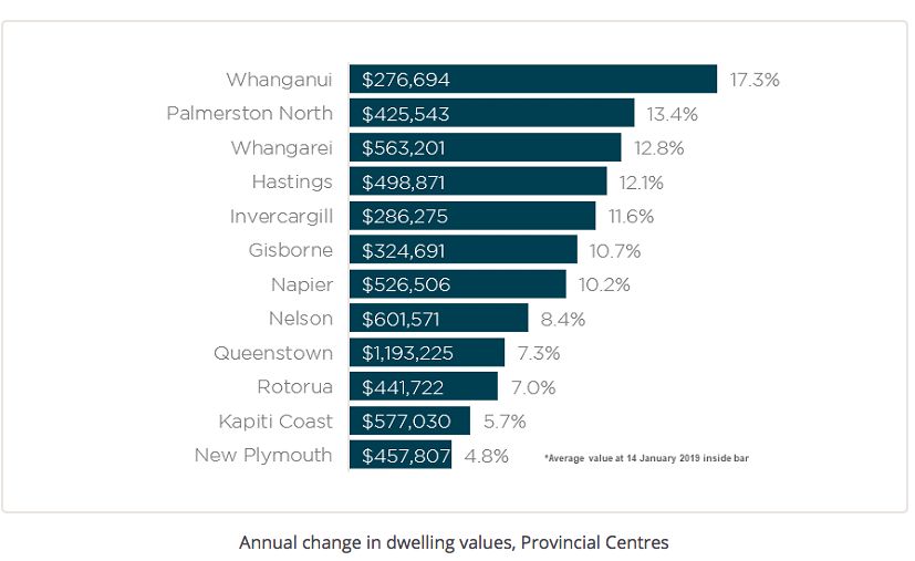 以年度涨幅最高的但尼丁为基准,去年全年涨幅超过这一水平的地方中心城市就有5个。