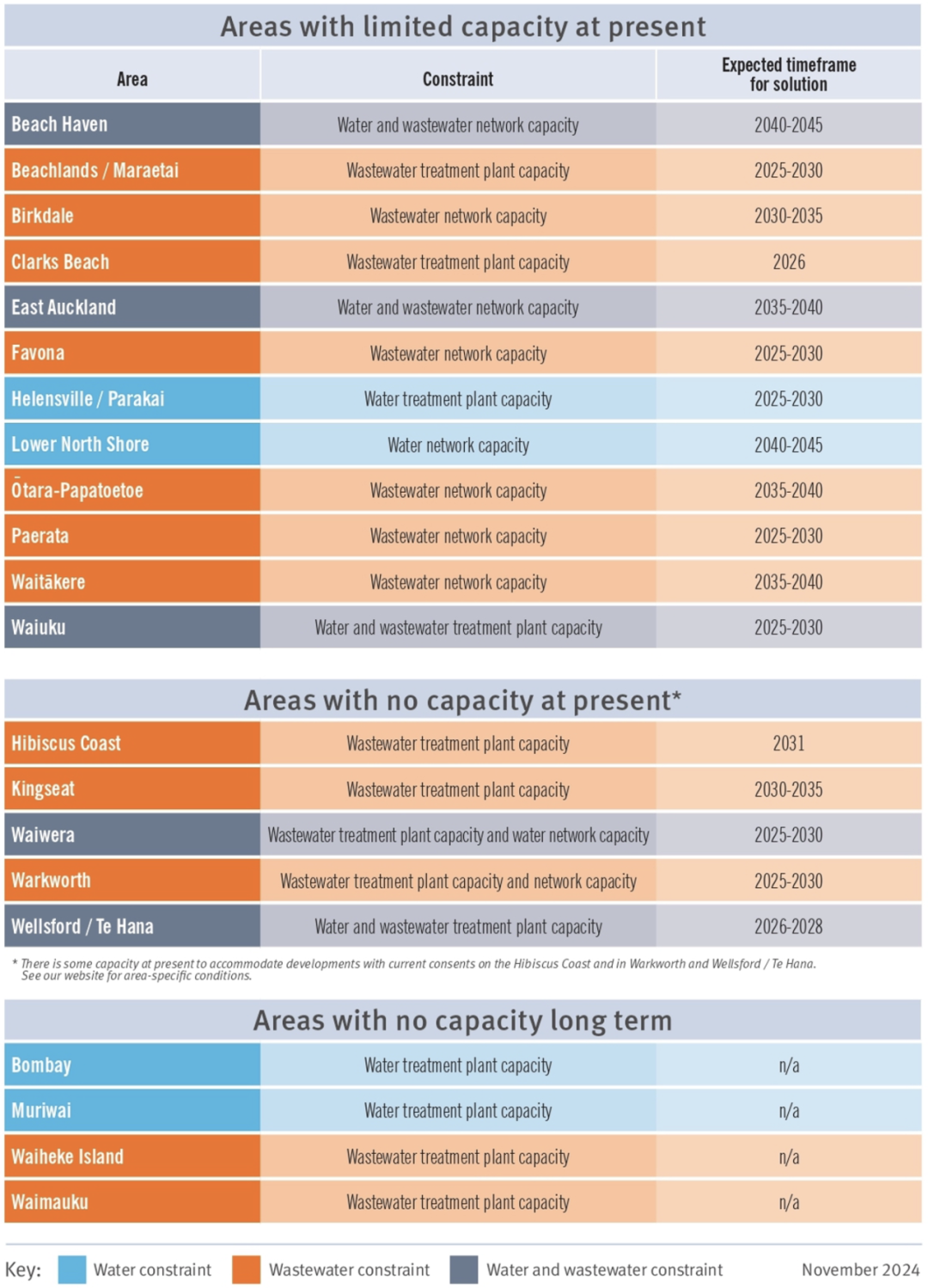 从下面的表格中可以看到,Watercare对部分地区依照供水/污水处理能力进行了归类,分为“目前供水和/或污水处理能力有限区域”,“目前供水和/或污水处理能力有限的区域”,“长期来看没有供水和/或污水处理能力的区域”。