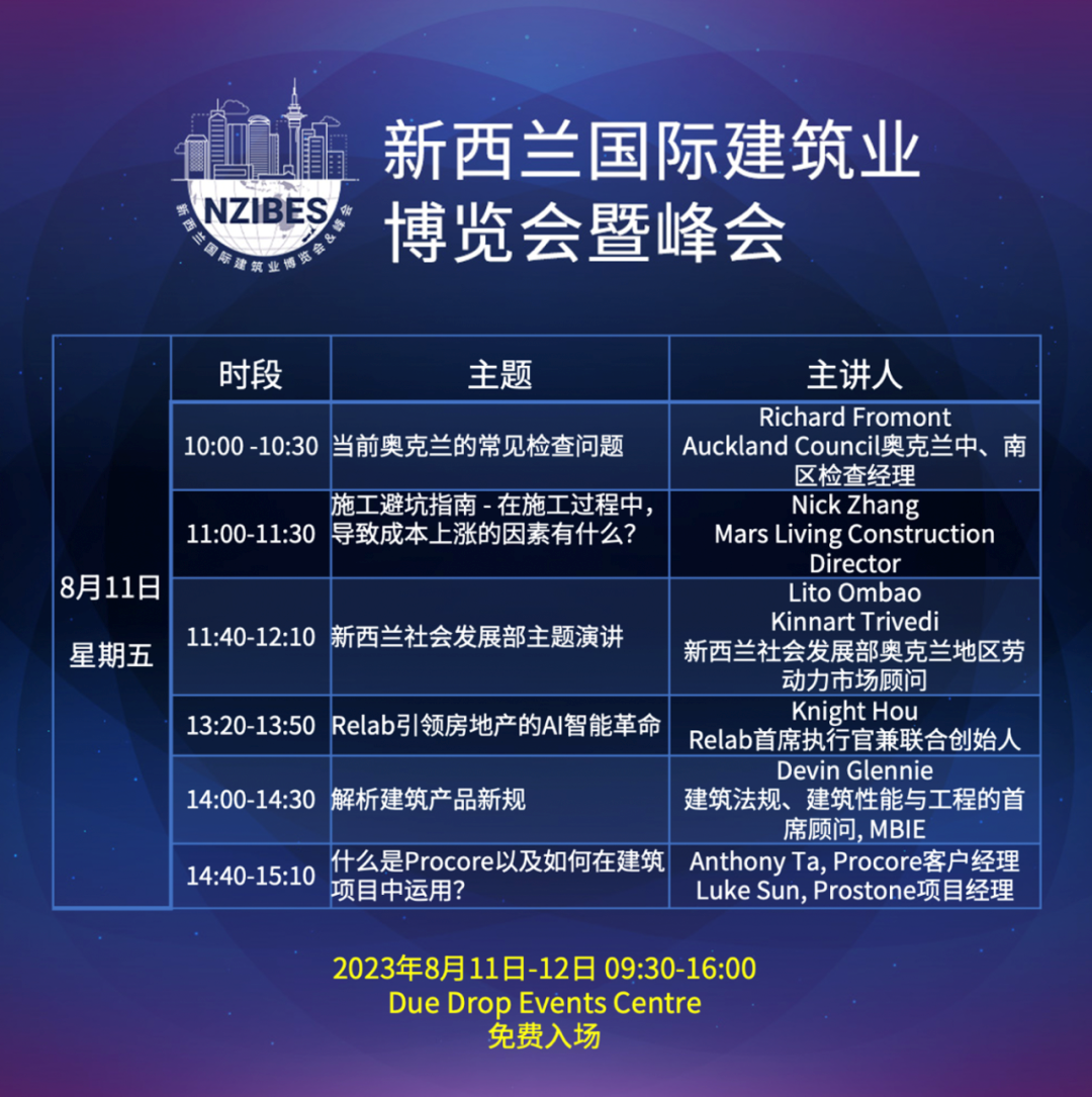 以8月11日的第五场workshop为例,我们将邀请到来自MBIE(新西兰商业、创新和就业部),建筑规范及功能和工程方面的专家顾问Devin Glennie来向大家介绍将于2023年12月11日生效的建筑产品的相关信息法规。接着,同样来自MBIE,信息与教育方面的经理Raymond Suen将给大家带来关于就业权利及义务,以及租赁法相关内容的宣讲。