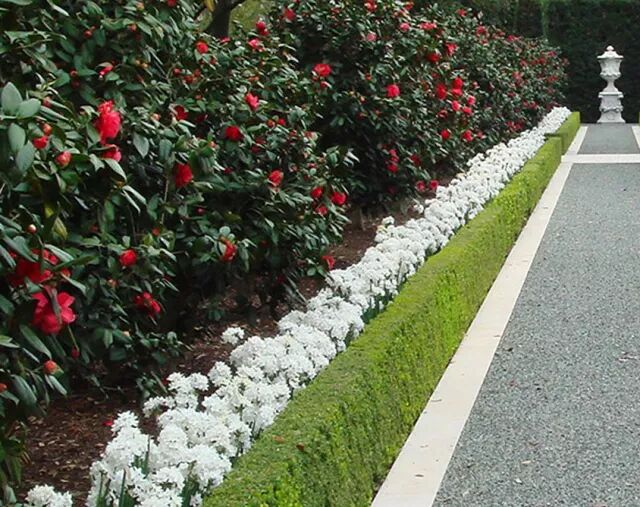 Camellia就是山茶花,是比较常用的绿篱树种之一。中国人会比较喜欢这个树种, 因为Camellia的花色品种非常繁多,颜色艳丽,姿态优美。可以给花园增色不少。但是Camellia的缺点是春夏花朵盛开时期,成熟花朵容易掉落腐烂,影响花园地面的干净美观。所以一般建议尽量种植在草坪或者铺multch的地面上,而不是砖块等的铺装地面边上。