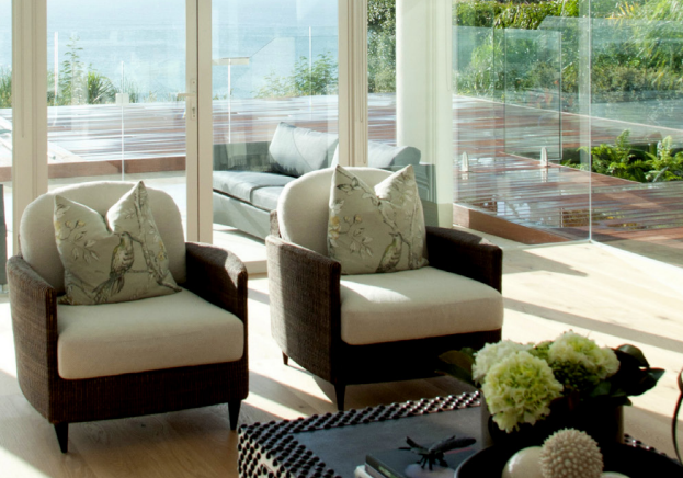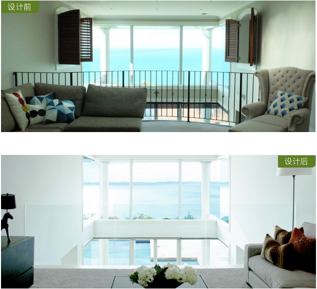 对景观的利用不仅局限于室外。Daniel把原本二楼起居室的老式弧形铁栏杆改成了玻璃墙,透过玻璃墙和楼下客厅的大玻璃门窗,近可见院落中的泳池和植被,远可眺望海天一色。