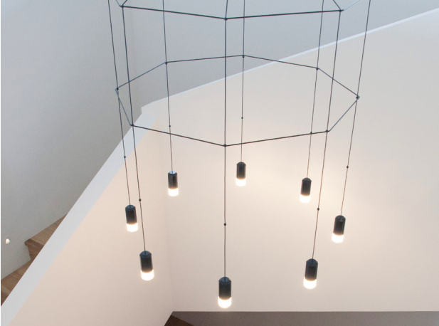 楼梯的灯则更加强调线条感,网状结构的灯线不仅不会阻挡视线,轻盈的线条还能增加空间的现代感。