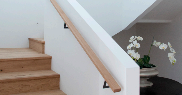 同样被临时改变的还有楼梯的扶手,原本设计的是白色喷漆的铁艺扶手,由于现场施工的失误,才有了木质加金属件固定的新方案。