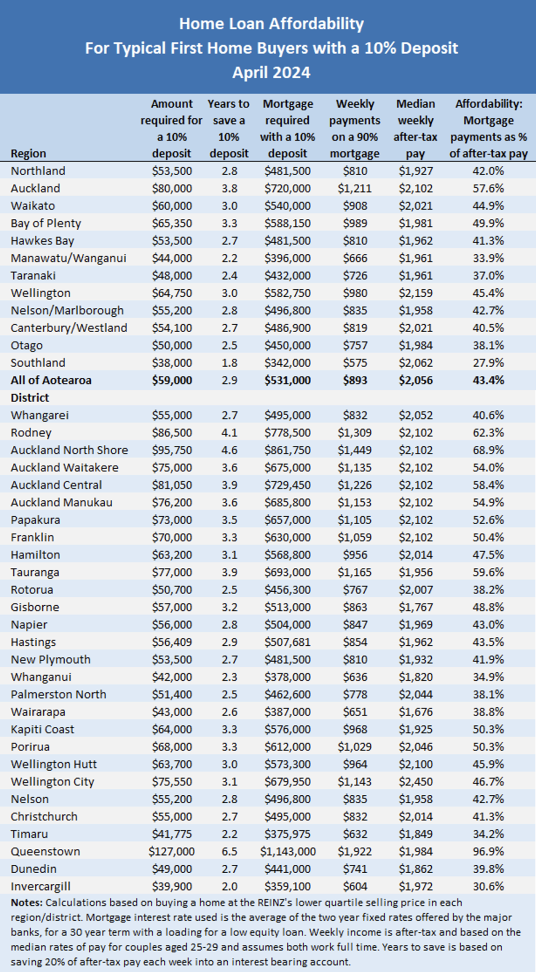 2024年新西兰各地区支付了10%首付款买家的可负担能力对比图 (来源interest.co.nz)