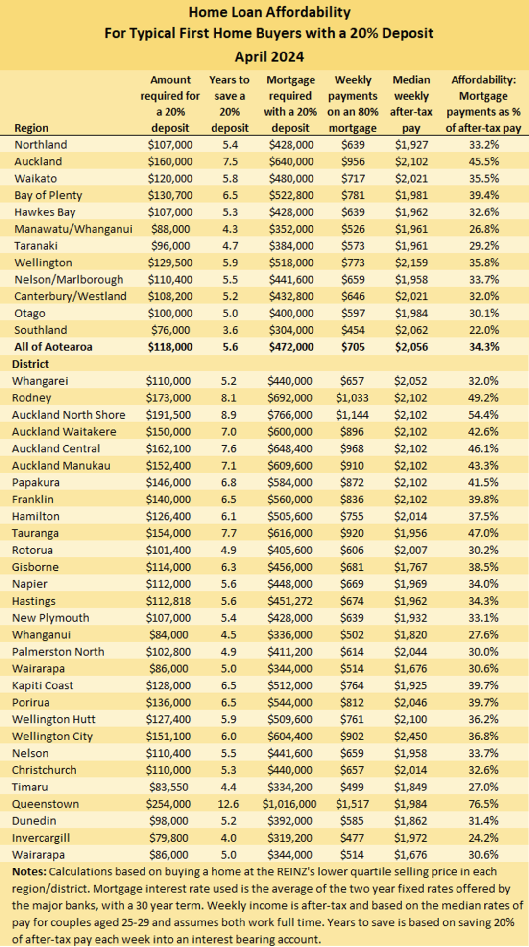 2024年新西兰各地区支付了20%首付款买家的可负担能力对比图 (来源interest.co.nz)