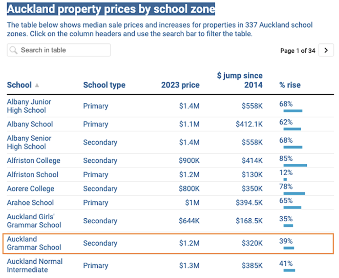 新西兰媒体NZ Herald采用Valocity的数据,对奥克兰学区房的房间进行了追踪报道。结果显示,奥克兰文法学校学区内2024年的房屋中位价为$120万纽币,自2014年以来上涨了$32万纽币,涨幅比例为39%。