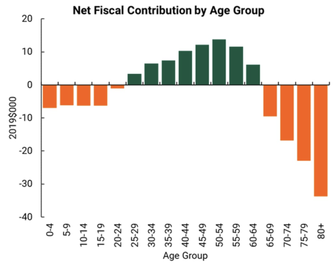 新西兰不同年龄段的净财政贡献示意图(来源:RNZ)