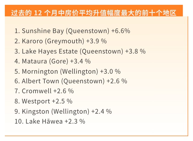 但他同时表示,高利率水平对价值在2000纽币或以上的房产市场的影响是微不足道的。例如,Featherston是今年全新西兰范围内最疲软的房地产市场之一,房价下跌了16.6%,而皇后镇的Sunshine Bay却以6.6%的房价增长率位居各地区榜首。