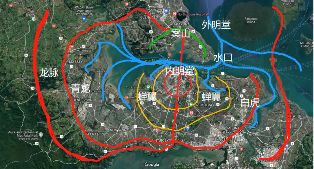以奥克兰市中心立极来看,青龙、白虎位完整,青龙略高,白虎低伏,明堂见曲水环抱,远处见Glenfield一带的朝山相拱,后方见有多处众山依傍,例如Maungakiekie/one tree hill, Maungawhau/Mt Eden, Maungarei/Mt Wellington等。有此形势,奥克兰的未来必定会更上一层楼。