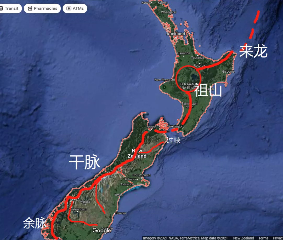 从风水的角度来看,新西兰全境多山,所以山龙的走势对新西兰风水的影响颇大。新西兰的龙脉源自于昆仑山,昆龙山分支而出九条大龙脉覆盖世界各地。而新西兰的山脉属于南干龙。南干龙亦是中国的三大干龙大脉之一,巽龙发脉,蜿蜒延长,途径泰国,越南,菲律宾群岛,印度尼西亚,澳洲,最后再从新西兰的东北方Te Araroa一带入境,延绵悠长,贯穿北岛中部。最后再在北岛南端,惠灵顿附近过峡南下,形成南岛西海岸的大山脉。