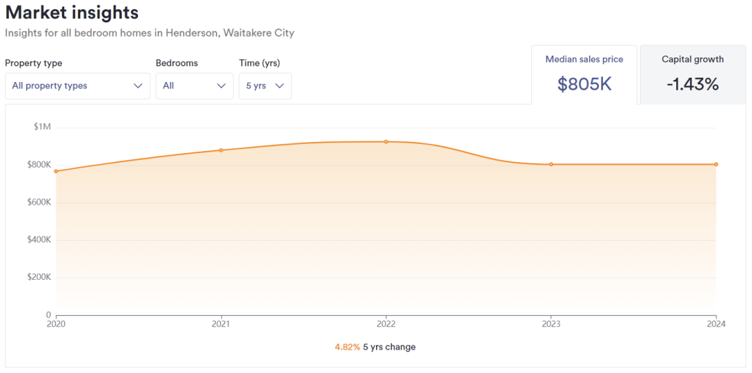 根据Oneroof的统计,Henderson所有类型房产的房价中位数为$80.5万纽币。四房房型的价格大约在$104万纽币左右,接近于奥克兰全市房价中位数。