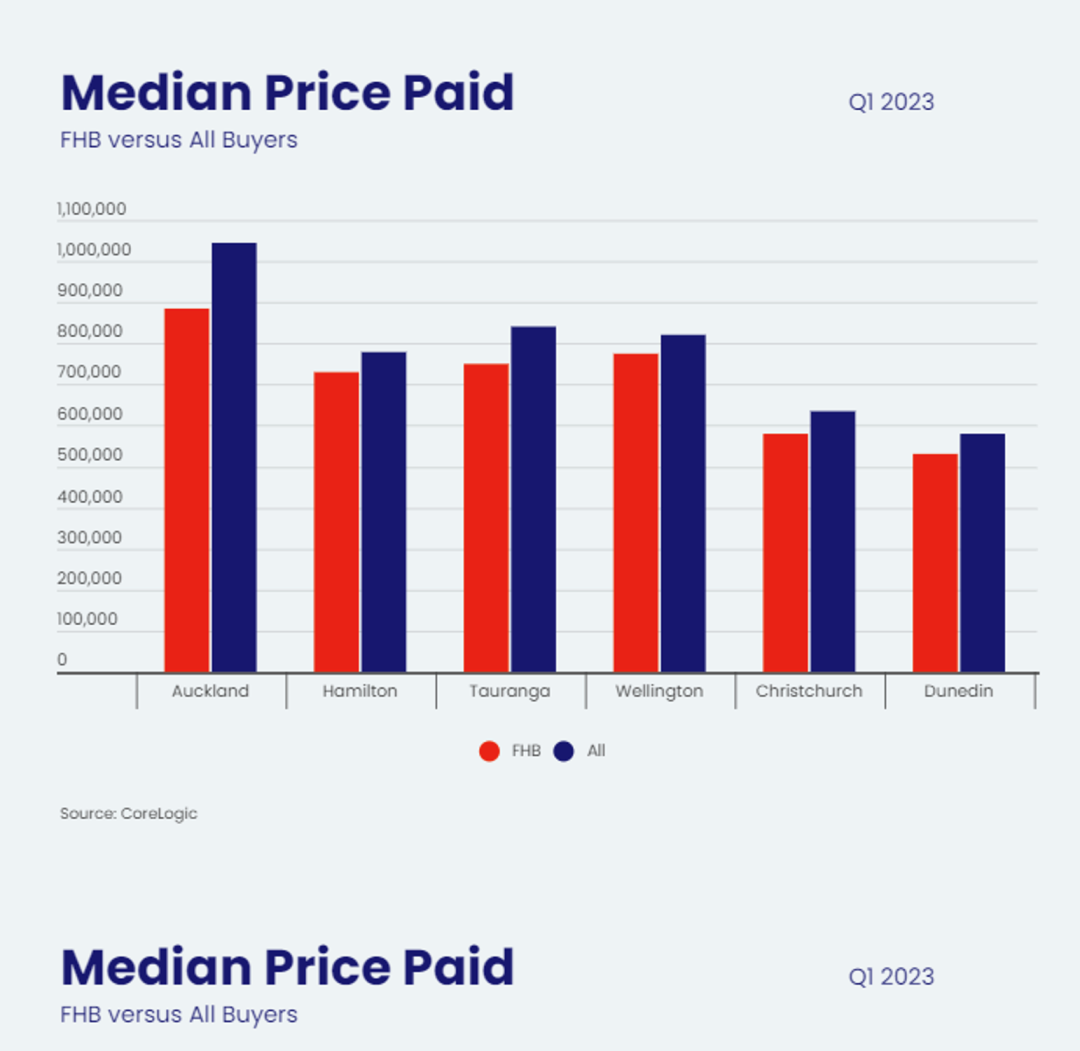 在2023年第一季度,奥克兰市的首次购房者的中位数购买价格最高,为885,000纽币(相比之下去年为1,000,000纽币),而惠灵顿、陶兰加和汉密尔顿的房价都在775,000到730,000纽币之间,基督城和达尼丁的房价都在600,000纽币以下(分别为580,000纽币和531,000纽币)。