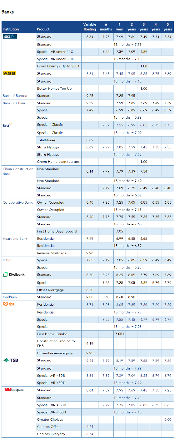 以下为新西兰各大商业银行抵押贷款利率一览表: