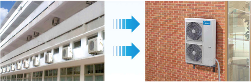 而民族品牌美的带来的迷你VRF空调系统则可以完美解决以上问题,因为仅仅一台ODU即可连接高达9台室内空调机且作为统一的一个系统,不仅安装便捷、维修简便而且能长期保持的高效运行,相比普通分体空调可大大减少使用成本。