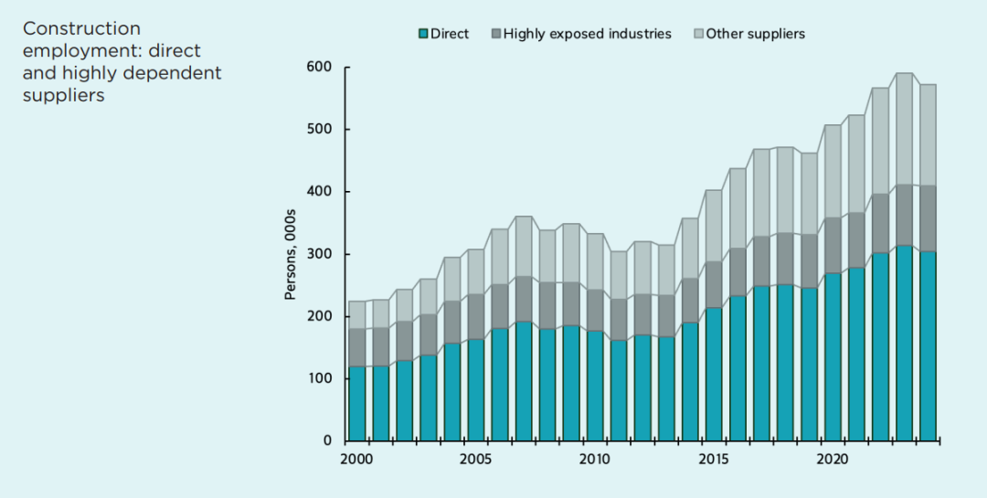 供应商支持的就业人数也展现出显著的增长趋势。建筑行业不仅直接雇佣大量人员,还通过各类供应商创造了大量就业机会。这种多层次的就业结构揭示出建筑行业对整个供应链的深远影响。从2000年至2020年,总就业人数从约300,000增加到约600,000,几乎翻了一番。