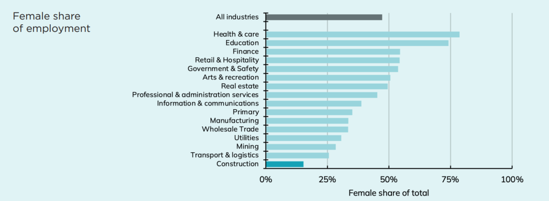 建筑行业仍然是一个男性占多数的行业,仅有15%的从业者为女性,而所有行业的平均比例为47%(见图3)。这种性别比例的显著差异表明,未来的招聘需要挖掘之前未充分利用的劳动力市场部分,即女性就业者。企业需要在领导力和文化方面进行投资,以招聘和留住更多元化的劳动力。