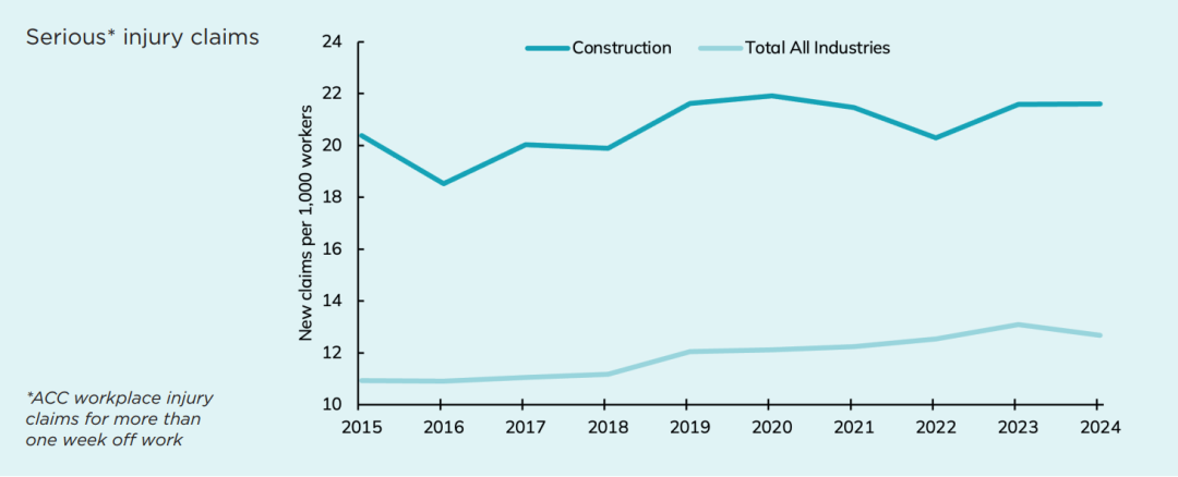 建筑业的另一个特点是工作中受伤人数众多,工作场所安全仍是十分重要的问题。2024年,每1000名工人中有22人遭受重伤,比新西兰全行业的平均水平高出70%,比澳大利亚建筑行业高出16%。这意味着,新西兰建筑业从业者受伤的可能性比新西兰“典型工作”从业者高出70%,比澳大利亚建筑业从业者受伤的可能性高16%。
