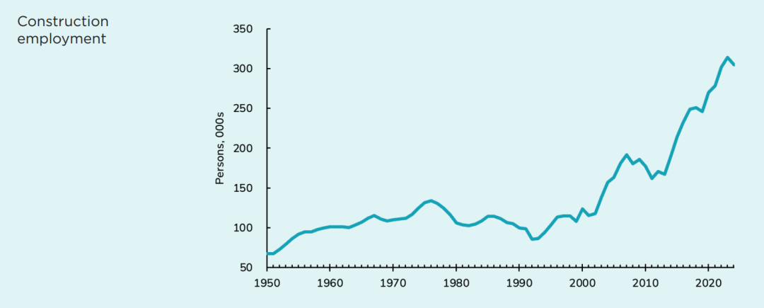 根据数据,自1950年以来,建筑行业的就业人数呈现出总体增长的趋势,特别是自2000年代初开始,增长速度显著加快。尽管1950年至2000年期间,行业经历了数次波动和稳定期,就业人数在约100,000至150,000之间徘徊,但从2000年到2024年,建筑行业的就业人数从约120,000迅速增加到超过350,000,增幅接近三倍。