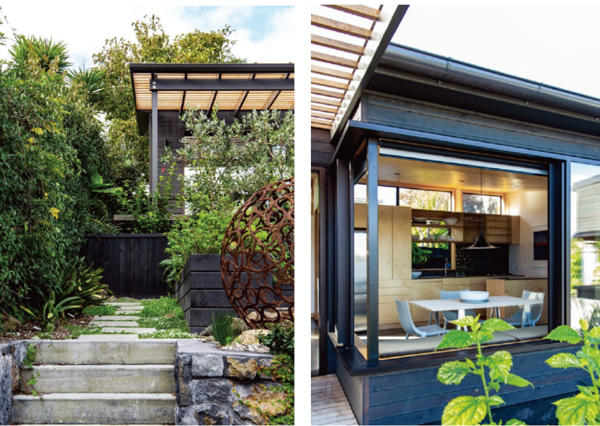 左:入口可见郁郁葱葱的花园与石阶,同时提升了后院小住宅的独立性和隐私性