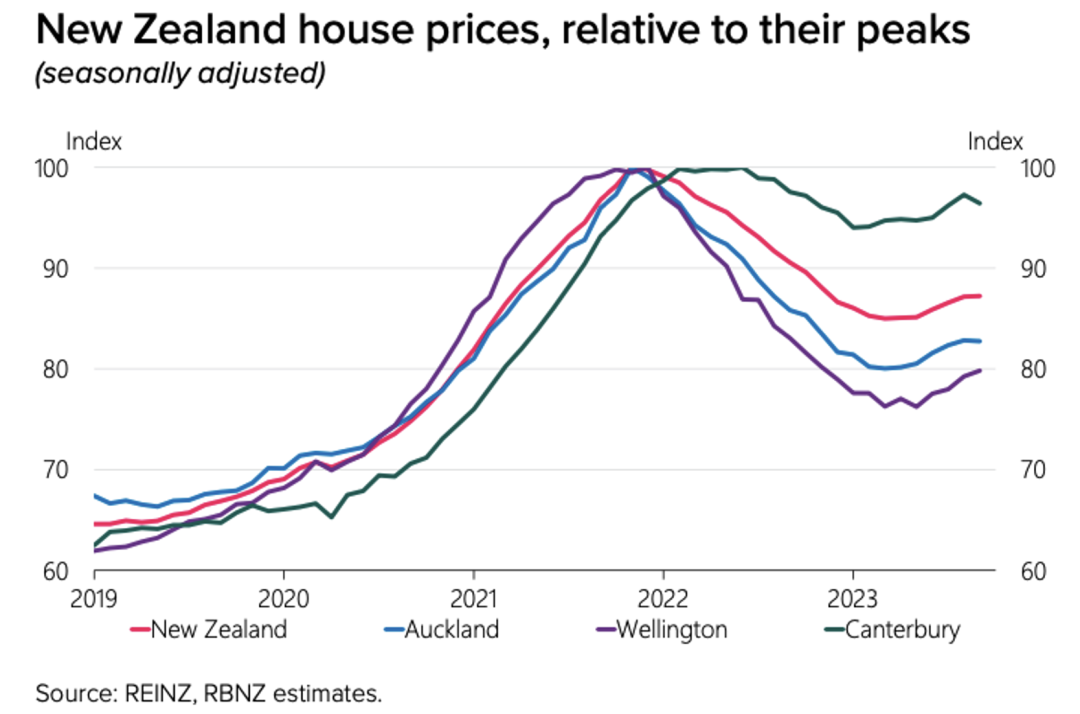 这一轮涨跌中,以奥克兰、惠灵顿、基督城和全纽平均值来看,各地上涨的幅度相当接近,但回落和见底过程则存在显著差异。