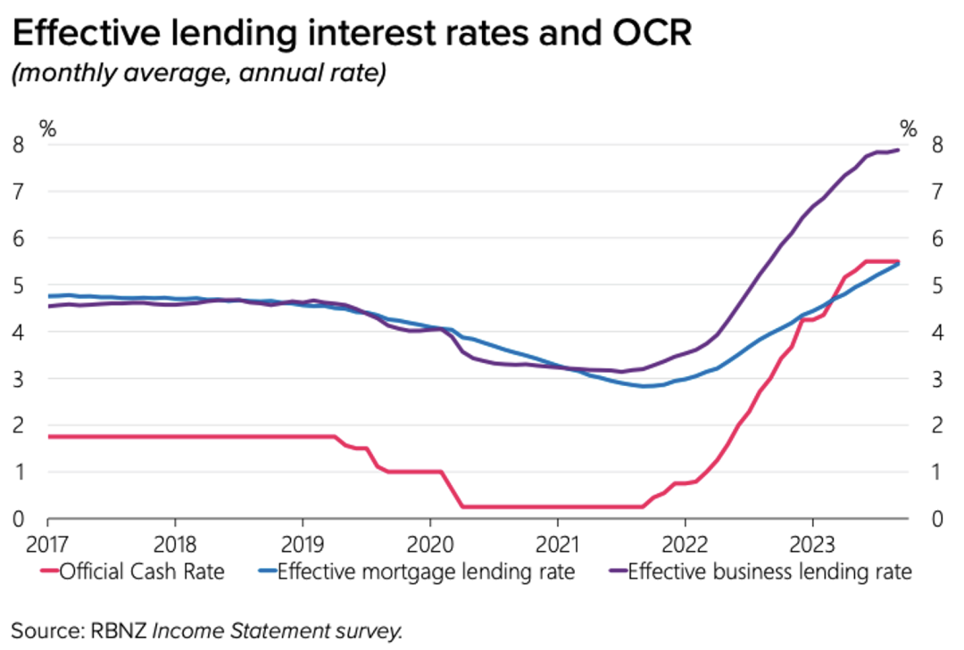 随后出现的大通胀让央行措手不及,并快速加息应对。从2021年8月到2023年2月,接近1年半时间里,新西兰合计加息高达5.25%,高利率一直保持到现在。对房产市场至关重要的商业银行1年期和2年期按揭固定利率,则在最近的3个月还在持续微幅上涨。