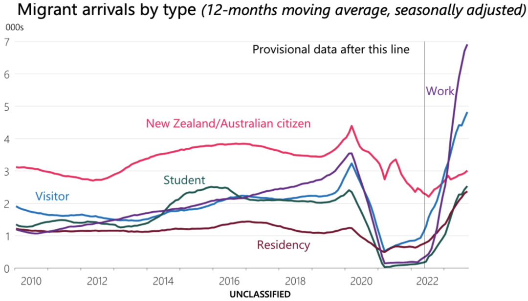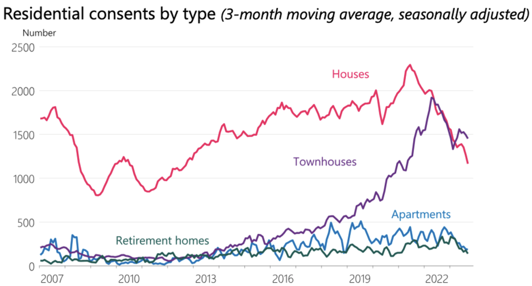 供应见上图的曲线,这是新西兰的新房营建许可(Resident Building Consent), 2021年下半年见顶后回落已经接近2年。理论上,从得到营建许可到上市大约是12-19个月,也就是说,这将从18个月后影响上市新房的供应量。