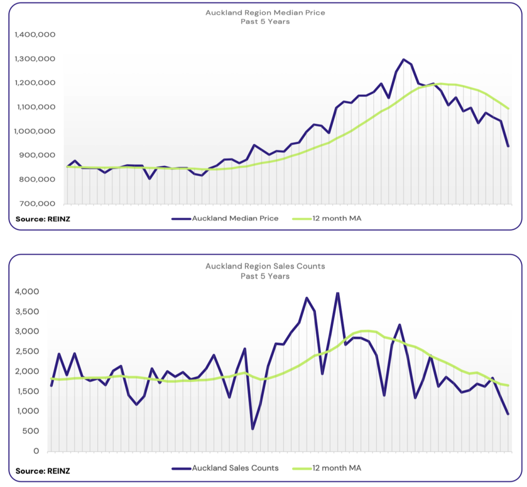 下图分别是2023年2月时候奥克兰的房价和成交量,可见当时:量价低迷,一眼见不到头……