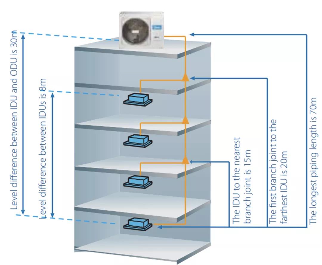 Atom Mini VRF提供了100m的总管道长度的可能性,室外和室内单元之间的最大高度差为30m。室内机之间的高度差可达10m。这样超长的管道设计长度完全能满足新西兰几乎所有的使用需求。