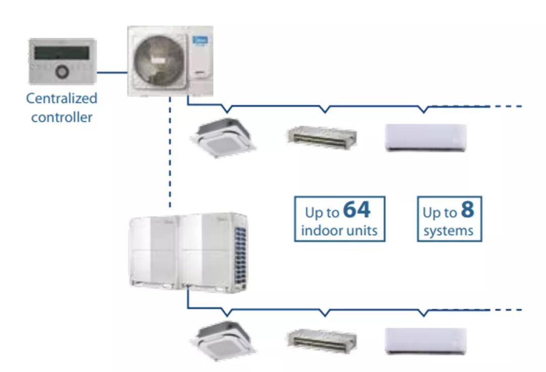 可在一个集中控制系统中控制多达8个系统,其中高达64台室内机和8台的Atom室外机或者其他美的VRF系统,非常方便管理者统一管理设备。