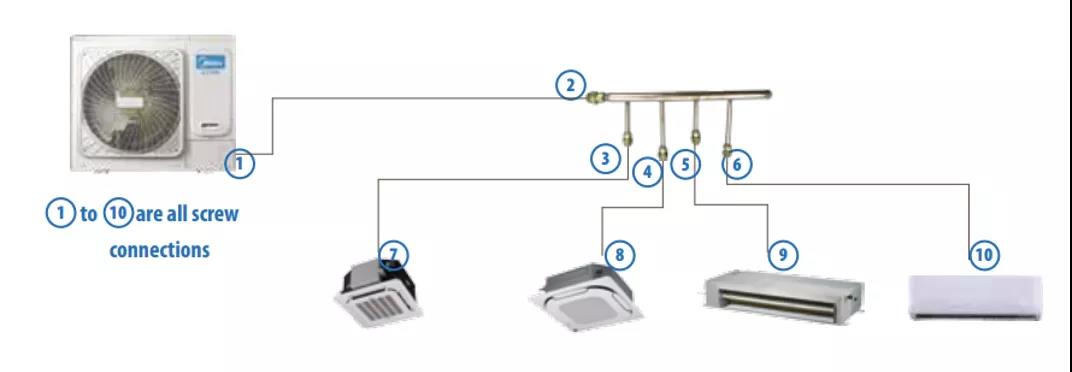 整个系统以螺纹连接的方式连接是市面上最容易安装的一款VRF,Atom VRF系统所有部件使用螺纹连接,可以大大简化安装工序和难度。提供的多种分歧管(从一分二到一分六)又可以大大节省安装成本和时间。