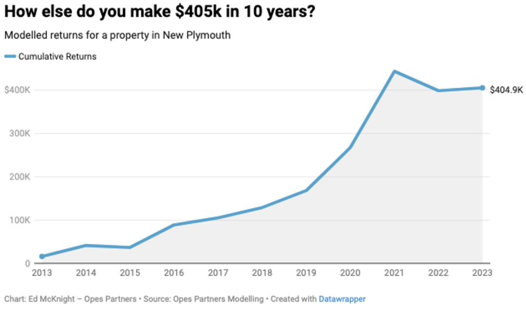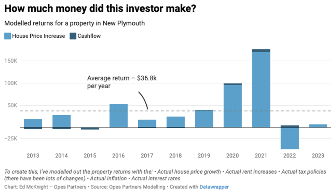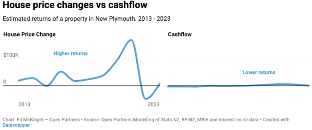 上图所建模型考虑到了利率,通货膨胀率以及过去十年中发生的三次不同房产税的变化。根据该模型,到2023年底,该房产的价值将翻了一番多,房主获得了40多万纽币的资本收益。如果按年来计算收益,在不同年份里,投资者所赚取或损失的资金波动则会更大。