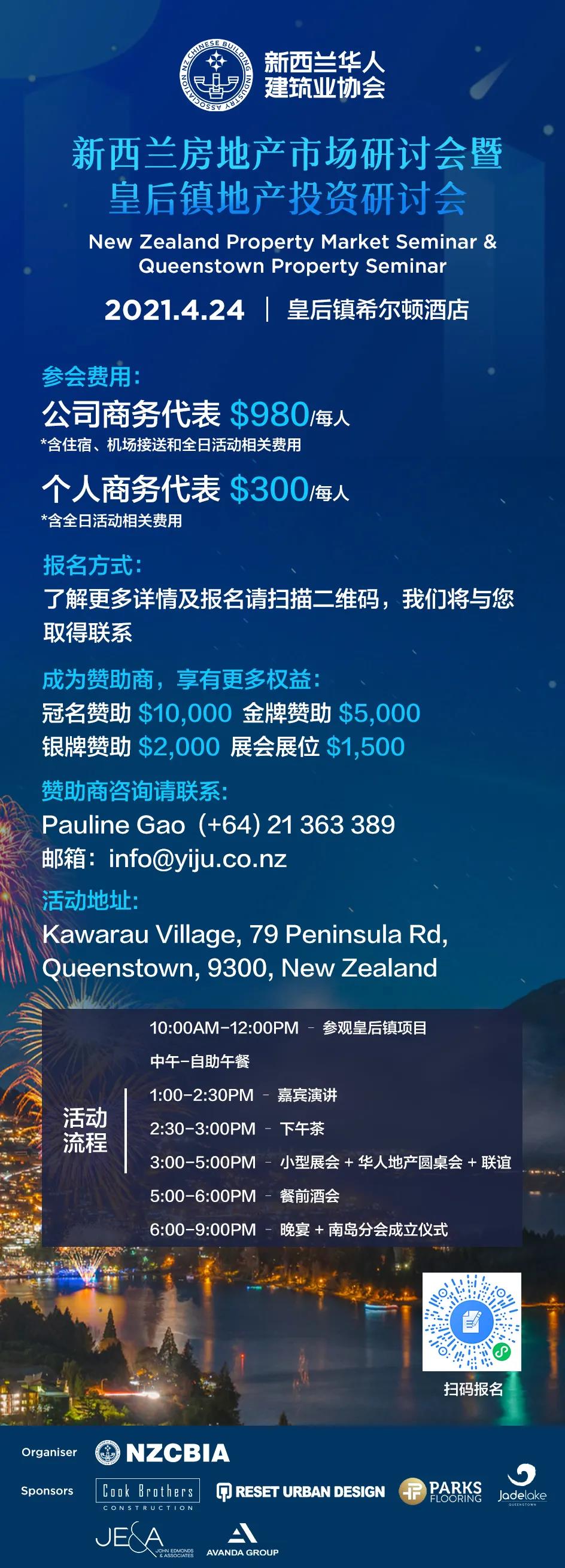 目前,活动赞助商招募正在火热进行中,现已吸引了多个知名企业的大力支持,包含:房地产开发公司Avanda Group、著名建筑公司Cook Brothers Construction、知名城市规划和景观设计公司Reset Urban Design、业内备受美誉的地板公司Parks Flooring, 以及皇后镇本地开发公司Jade Lake Queenstown和皇后镇本地规划顾问公司John Edmonds & Associates。逸居新西兰作为本次活动的唯一主要合作媒体,将为大家带来更多活动现场的实时报道。