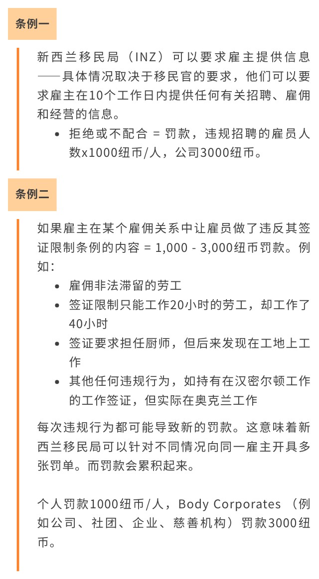 简而言之,判定违规的方式非常多,如果对政策的更新没有敏锐度,或者理解不够,就很可能在自己也没意识到的情况下违规。原来的雇佣问题可能只需要雇主去和雇佣关系局(Employment Relations Authority)打交道,然后上庭调节后走赔偿或罚款流程,但现在INZ也可以从中干预去确保海外雇佣流程的合法性。INZ不仅有权罚款,也有权取消这个公司的信誉雇主认证。雇主现在面对多方压力和复杂的政策,如果您对自己现在的雇佣关系有任何问题,可以随时联系我为您解答并评估风险。